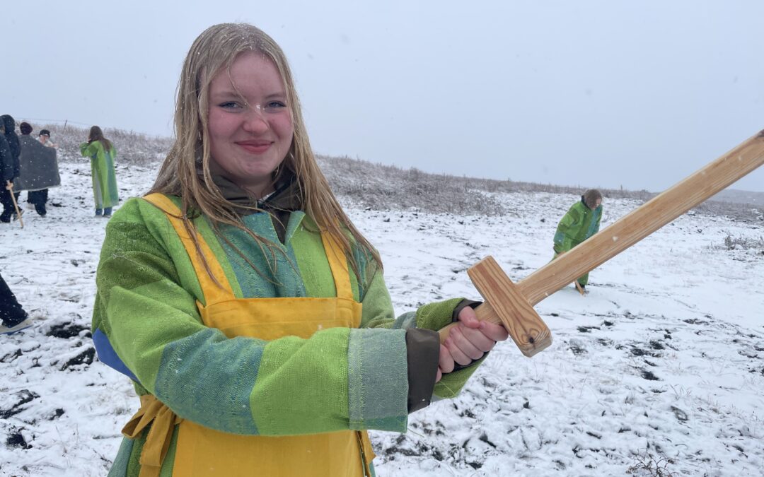 Frá Þingskálum var keyrt að Eystri-Rangá. Þar börðust nemendur með sverðum, spjótum og skjöldum sem Andrés Pálmason hagleiksmaður á Laugarvatni smíðaði sérstaklega fyrir Njáluferðir skólans. Sverðin eru enn ómeðhöndluð en skildina skreyttu nemendur í myndlist og máluðu fyrir ferðina. Þá klæddust nokkrir nemendur nýsaumuðum víkingabúningum sem starfsfólk skólans saumaði og stendur til að sauma mun fleiri og mála sverðin og er hér um að ræða verkefni í góðri vinnslu. Þess má geta að búningarnir eru saumaðir úr gömlum gardínum úr skólanum.